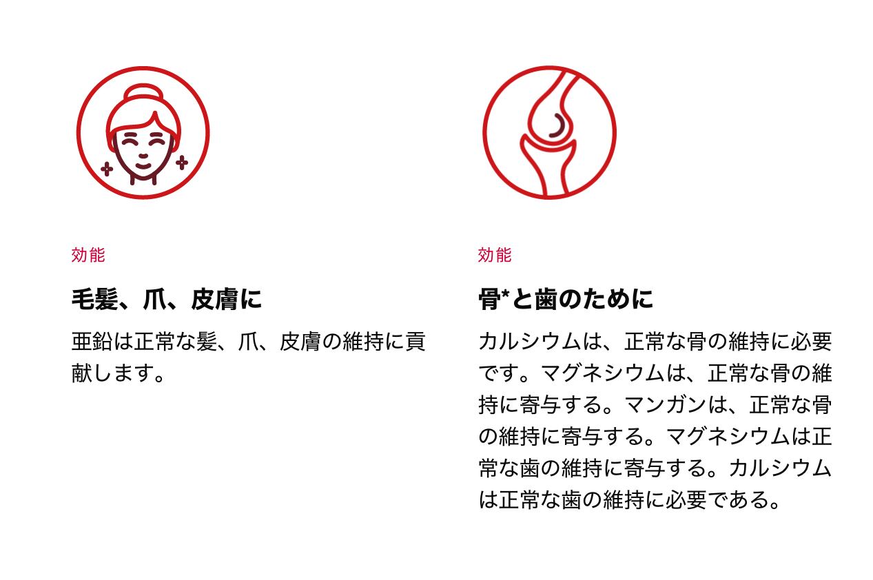 不足しがちなカルシウム(乳由来)、クロム、マンガン、セレン、マグネシウム、カリウム、亜鉛、鉄、銅などのミネラルと、吸収を助けるビタミン3種を配合しました。EUで獲得した特許技術により、それらの物質が素早く吸収されます。